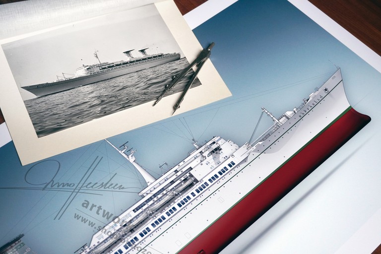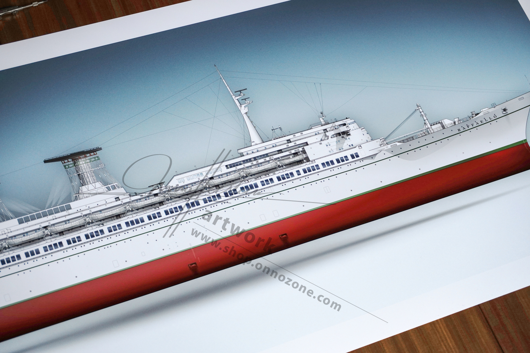 Imagining this print in a living room or study, it's like having a piece of history unfurl before you—the Raffaello slicing through the waves, her funnels catching the light, inviting you to daydream about glamorous voyages long gone. It's been rewarding to evolve that 2010 sketch into this grand edition, blending my love for design with the ship's timeless story. If you're a fellow admirer of maritime marvels, this might just be the perfect way to bring a bit of that Italian elegance into your space.
