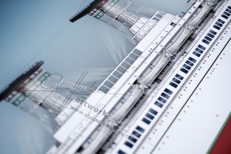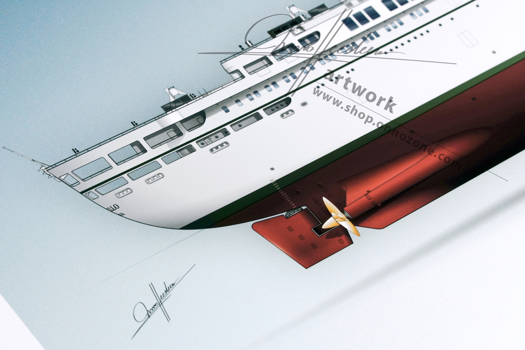 Fast forward to today, and I've revisited that passion with a fresh twist. Inspired by the enduring allure of the Raffaello, I've scaled up the illustration into something truly immersive—a massive, museum-quality Giclée print stretching a full meter long. This new variant isn't just bigger; it's a portal to the past, drawn with even greater precision based on exhaustive research: original photographs, detailed drawings, general arrangement plans, and authentic design specs. Printed on premium 260gsm, acid- and lignin-free paper with a lustrous finish, it's built to endure for generations, much like the ship's legacy. The image itself measures 100 x 37 cm, framed by a subtle 3 cm white border that makes mounting and displaying a breeze (though the frame itself is up to you, to match your own style).